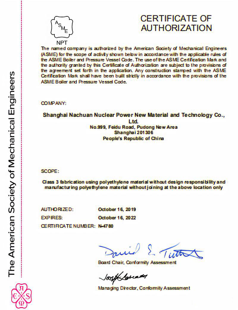 近日,纳川股份旗下子公司上海纳川申请的核3级HDPE管道制造许可获得美国ASME协会批准,并获得NPT证书,证书显示授权上海纳川生产的核3级产品包含:聚乙烯管道和管配件以及用聚乙烯材料制造核3级部件(不包含设计责任),上海纳川获得此项许可的HDPE管道生产企业;